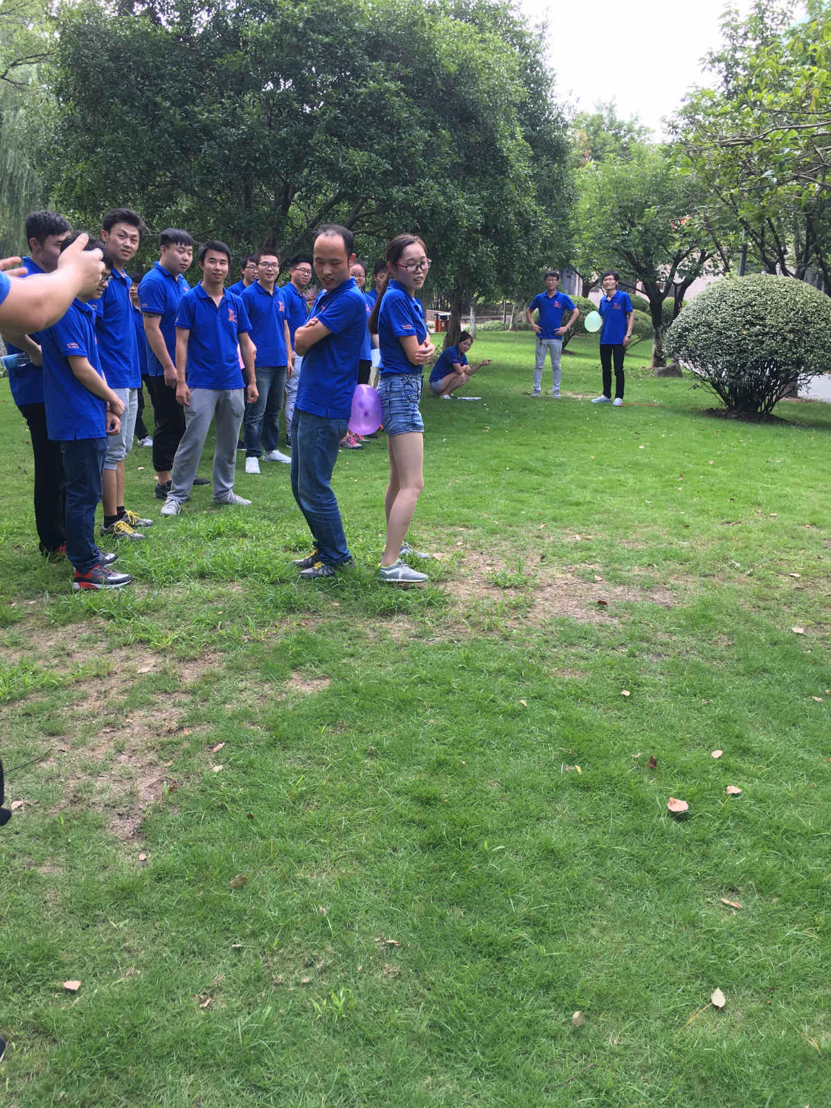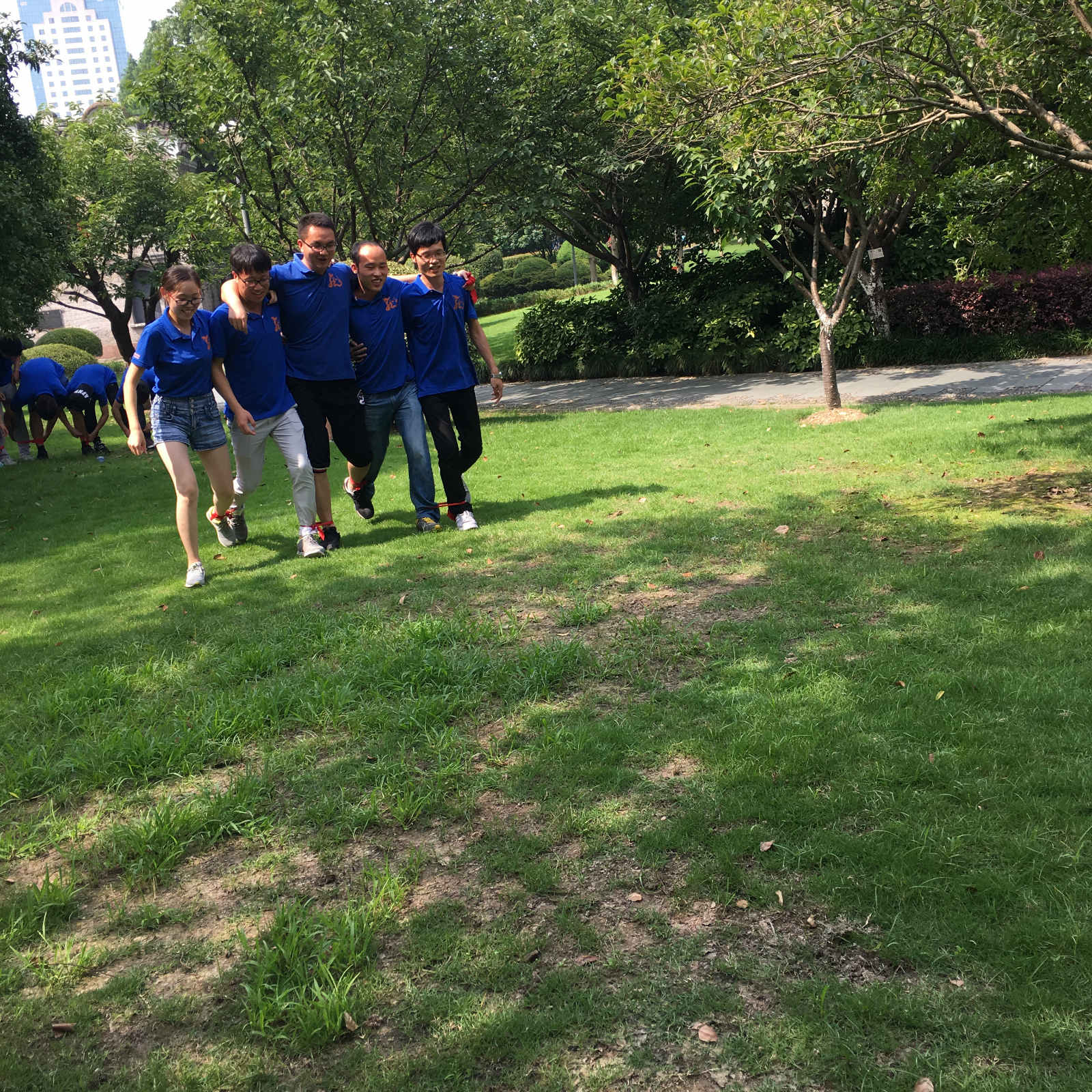 美味午餐后,2016届管理培训生在月湖草坪上开始了今日的团队竞赛,20名人员分为4个小组,分别命名“猛虎组”“海豹组”“靓猫组”“雄狮组“,四个小组你追我赶,毫不示弱,即使遇到惩罚,为了缩短时间也迅速完成,惹来欢笑一片。古代美男妖娆揽客,十指相扣深情对望,你动我猜心意相通,两人三足变成五人六足……乐趣横生。