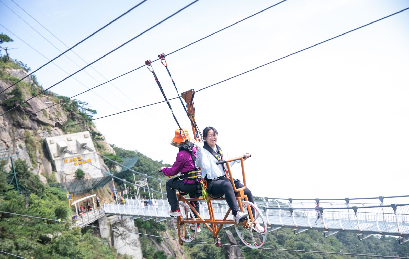 乘坐索道十分钟后抵到达山巅,今日阳光正好,清风徐徐,体感适宜。彩虹滑草的五彩缤纷,绿绿草地的一望无际,仅仅是伫立在此,已是一种享受;登临老鹰巢观景台、鸟巢观景台,是视觉震撼的云海奇观,光影薄雾中的山峰若隐若现,给人一种虚无缥缈之感;队员行走在水晶廊桥、云海栈桥、天空之阶、云中漫道,高空中的轻微晃动就让人尖叫不已,山涧在脚下显得深不可测、缥缈的云雾又给紧张的氛围添上一笔。悬崖秋千是云上草原的王牌项目之一,长阳人秉承着长阳无畏的精神和勇敢的斗志荡漾在悬崖之巅……